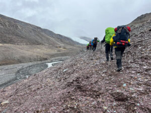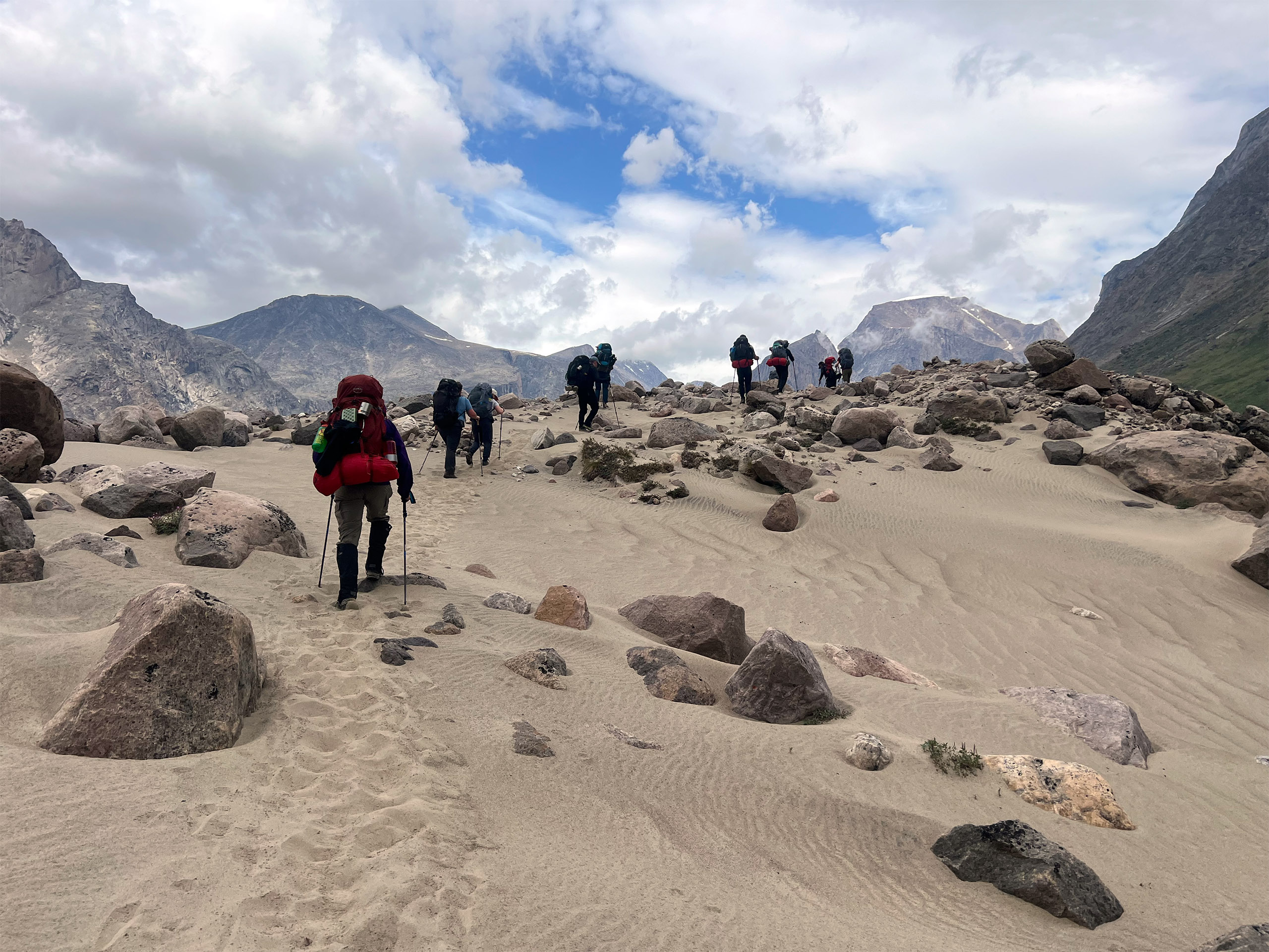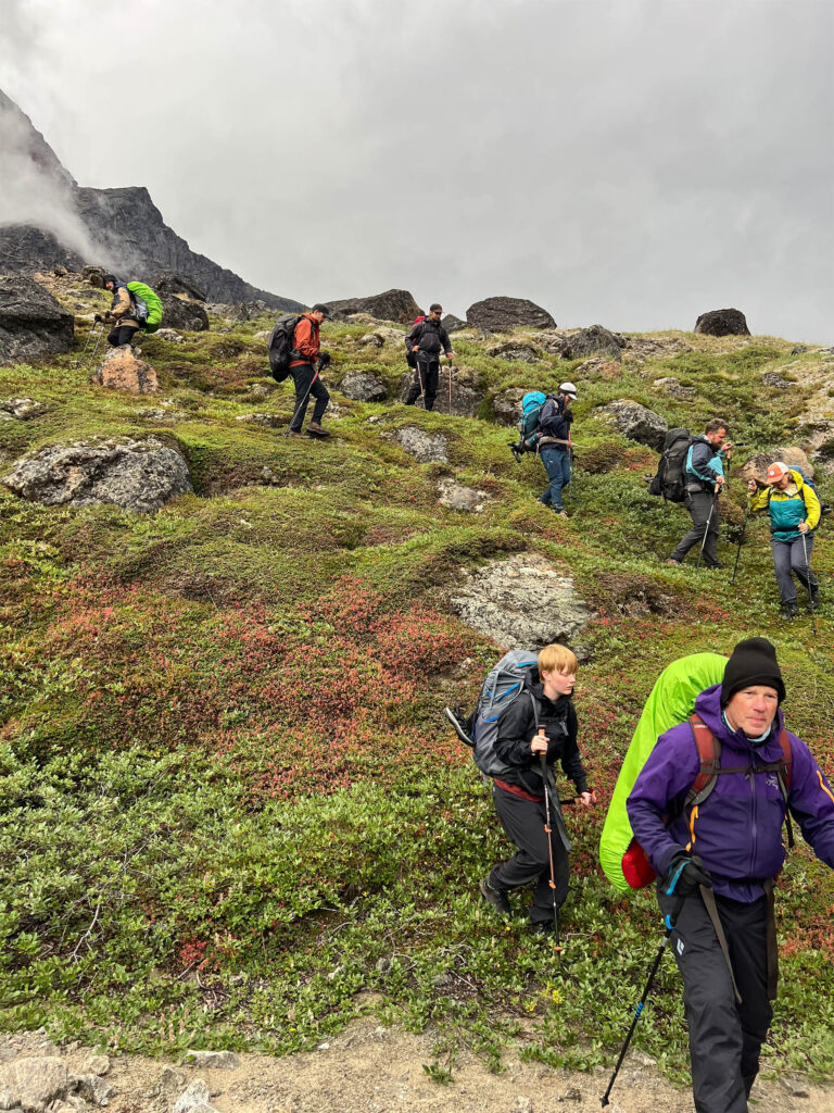 The most common thing we hear from our hiking participants on northern trips is this – “I trained hard but I was not prepared for this terrain!” There are mountains and valleys and stream crossings but there are no (or VERY few) trails. Sometimes we get lucky on empty river drainage channels or raised beaches, often referred to by guides in the north as “arctic sidewalks”, but these tend to be few and far between. Instead, we have a variety of terrain including boulders (think golf ball size to armchair size), river and stream banks (think steep sided at times but often only 1 metre in height) and bog (think “sole” sucking).